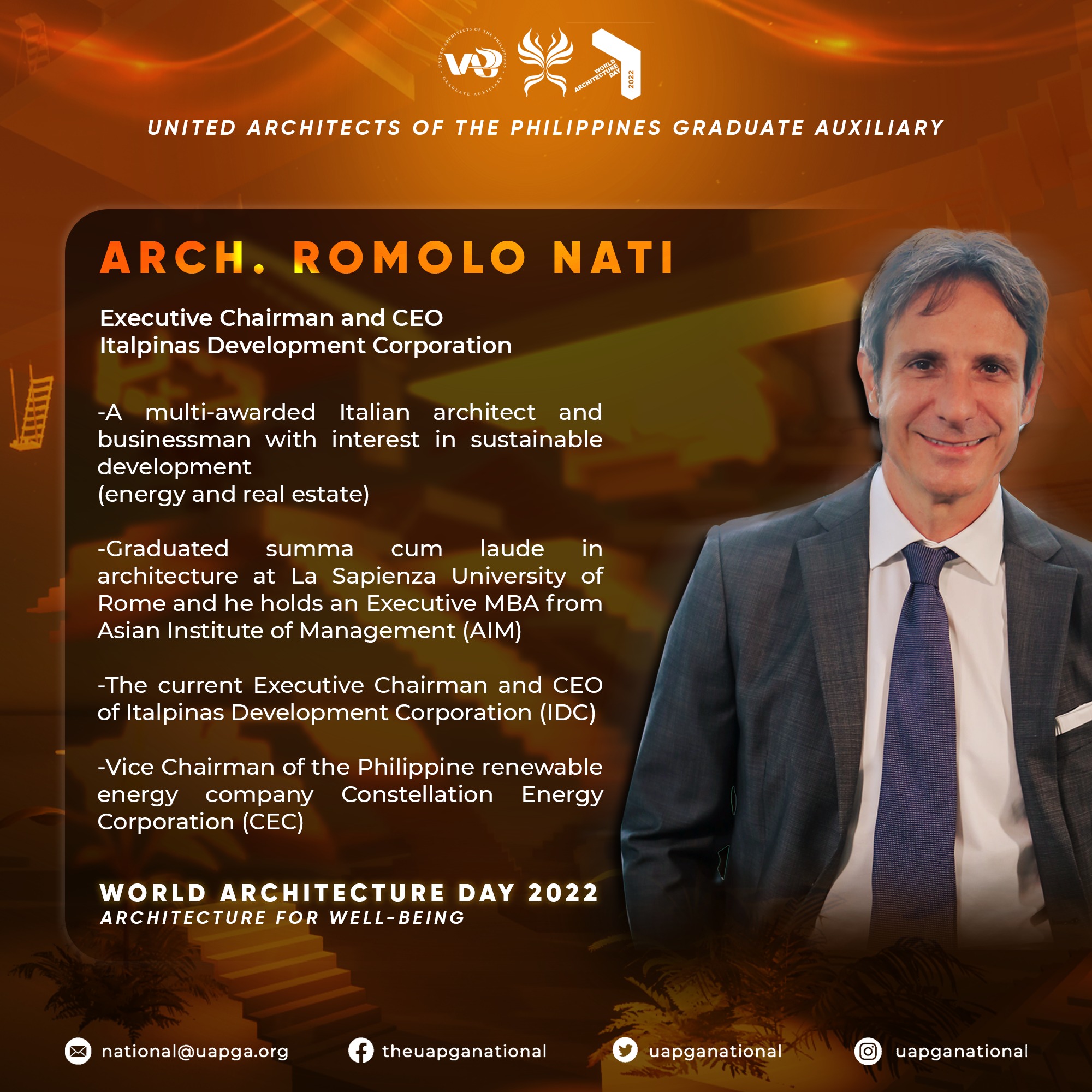 Last October 2, 2022, IDC’s Chairman and CEO Arch. Romolo V. Nati joined the United Architects of the Philippines Graduate Auxiliary to celebrate the recent World Architecture Day 2022 together with Arch. William Ti Jr. of  WTA Architecture and Design Studio,  a company that seeks to redefine the role of architecture in our society and focus on the creation of positive social impacts.
